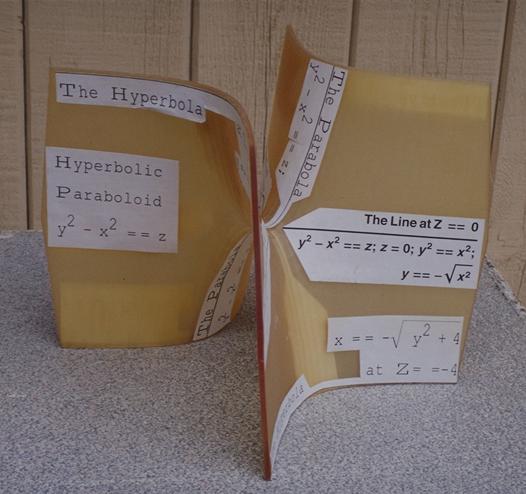 The Hyperbolic Paraboloid as a physical object may contain no abstract information to someone unfamiliar with the mathematics of it. The captions on the surface supply information about the surface specific to the region on the surface being read. The title gives the full equation of the surface. The curves traced on the surface contain text of the rearranged expressions for the curves resulting from holding one of the parameters to a constant value.